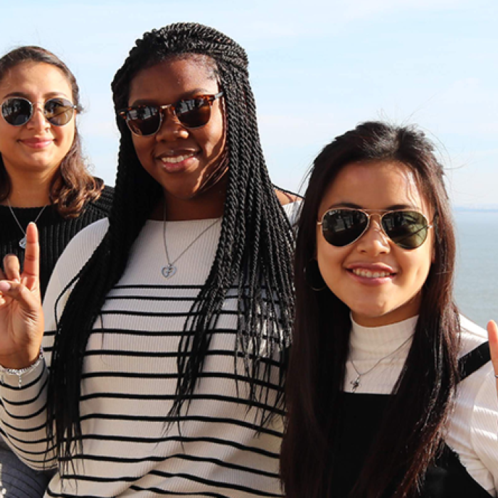 A group of UT exchange female students display the hookem sign overlooking the ocean in a foreign country.