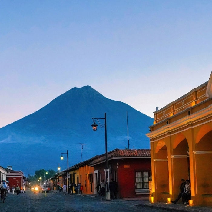 A perspective view of an old stone street and historic buildings lit up in the foreground framing the distant Agua volcano in Antigua, Guatemala during the blue hour of the evening.