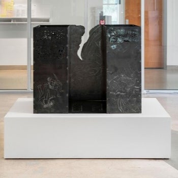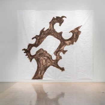 The exhibition featured a variety of pieces; one was a large reproduction of a construction tarp. Cut into it was a Mayan poem, titled “Deep Cavern, Invisible Work,” highlighting the barrier between predominantly white student bodies at North American universities and the Latino workforces that work in the background to support them.