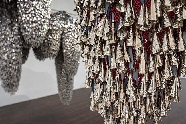 Known as “jingles,” these small metal bells reference the “Jingle Dress Dance,” which today represents an important Native American powwow dance and its accompanying regalia. Viewers can explore the intersection of history and community woven into every tin cone, offering an opportunity to create bonds across generations of human history as well as with each other.
