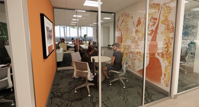 Texas Global staff members and stakeholders will appreciate the remarkable transformation of the advising spaces. Floor-to-ceiling maps of six vibrant cities — Seoul, Mumbai, Mexico City, Dubai, London, and Singapore — highlight UT Austin’s global network. The airy design and natural light conveyed by glass walls also invoke transparency and openness while presenting a private and secure atmosphere.
